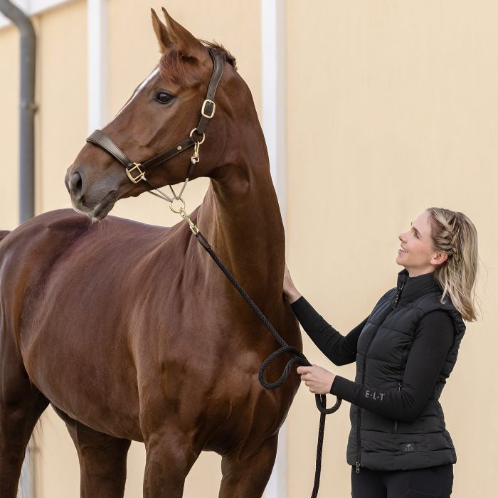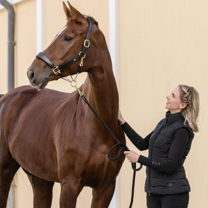 High-quality leather halter with anatomically shaped headpiece, adjustable on both sides. The noseband and headpiece are softly padded. Throat and chin straps are made of fine rope. Both parts are connected by a travelling ring, thanks to which it fits snugly and does not slip. It also avoids the danger of "kicking the rope".