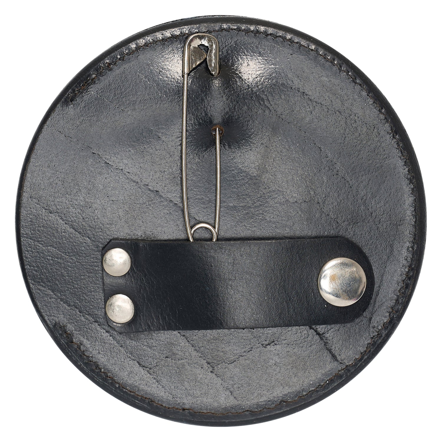 A classic round competition number set with a leather outer. The safety pin and snap button closures ensure secure attachment, and the set accommodates up to three digits.