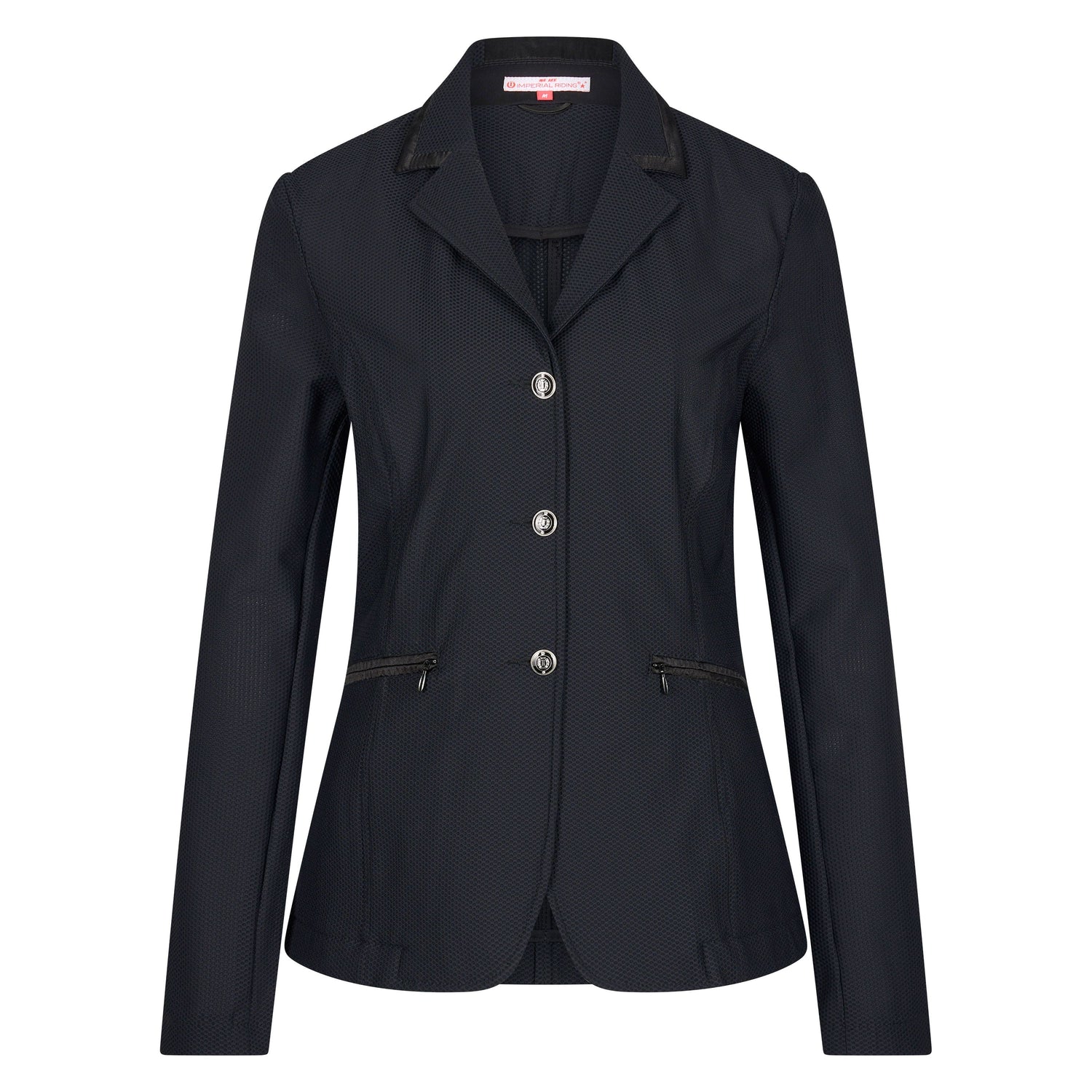 Crafted from ultra light, breathable fabric, the Imperial Riding Air Meshy Competition Jacket boasts a sleek, professional design. A covered zipper and three visible buttons secure the front, while mesh fabric is featured on the sleeves, collar, and lapel. Double weltpockets with covered zippers and a back slit add functionality, and the unlined design ensures maximum comfort. Along the edge, a satin fabric collar is adorned with a crystal Rhinestone button for a touch of elegance. Made from 4-way stretch fabric, this jacket provides both style and functionality for competition.