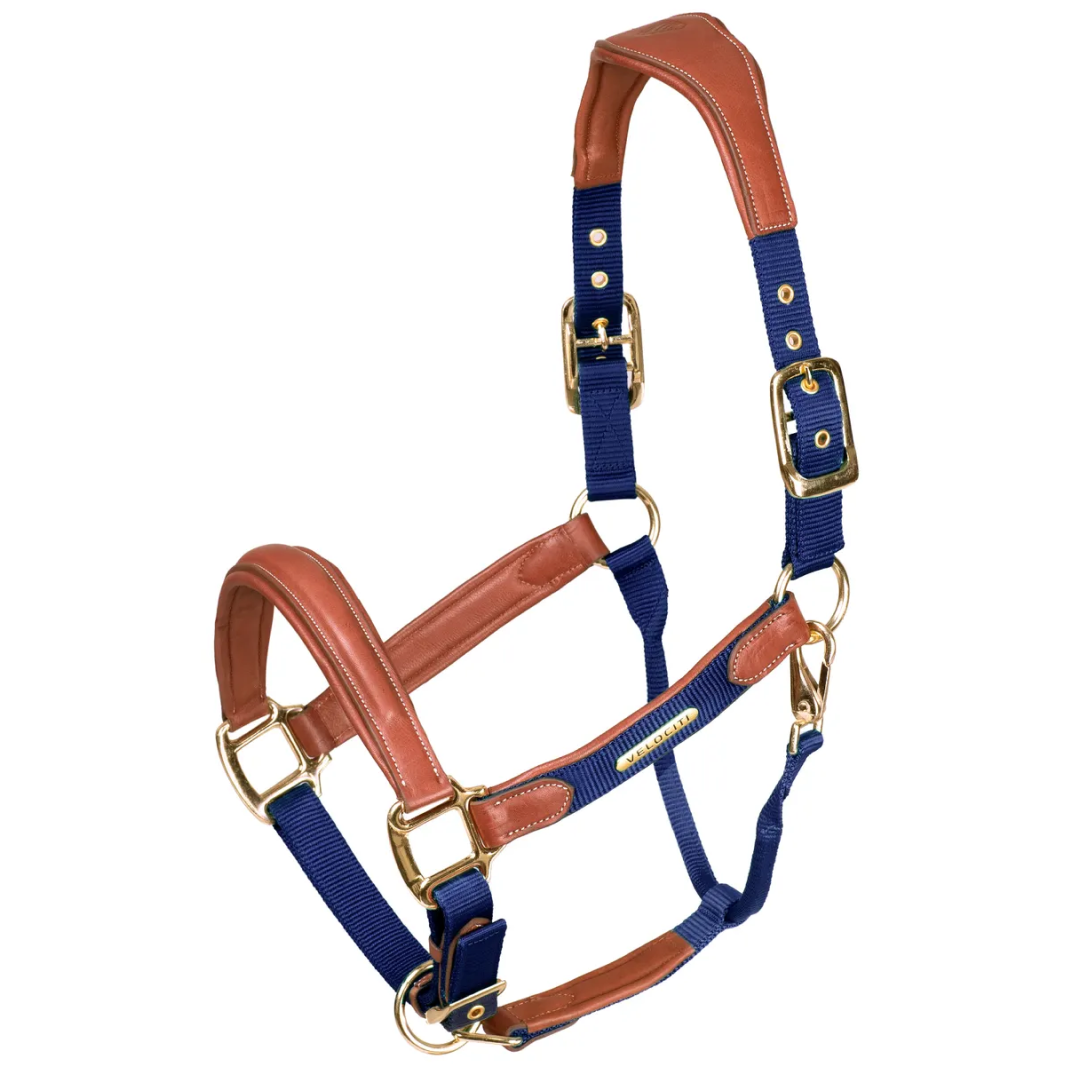 Anatomically shaped at the head and nose to disperse pressure, soft cushioned leather padding for enhanced comfort. The headcollar fastens with a double ended headpiece. A clip throatlash offers convenience. Double layer nylon inserts add strength and a contemporary feel. Durable brass colour eyelets and solid metal high shine fittings. A Velociti plate adds a distinguished feel.
