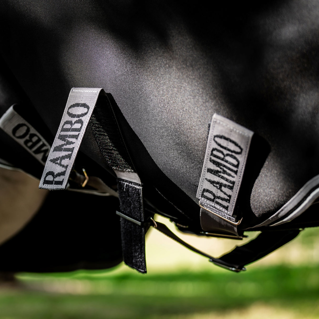 Other highlights include reflective strips for increased visibility, a waterproof tail flap for added protection, a wipe-clean tail cord, three crossed webbing surcingles with the Rambo® Safety Surcingle System for a secure fit, a Velcro sandwich hood attachment for optional hood compatibility, and leg strap compatibility for additional stability. The anti-static, anti-bacterial lining enhances both the comfort and hygiene of the rug.