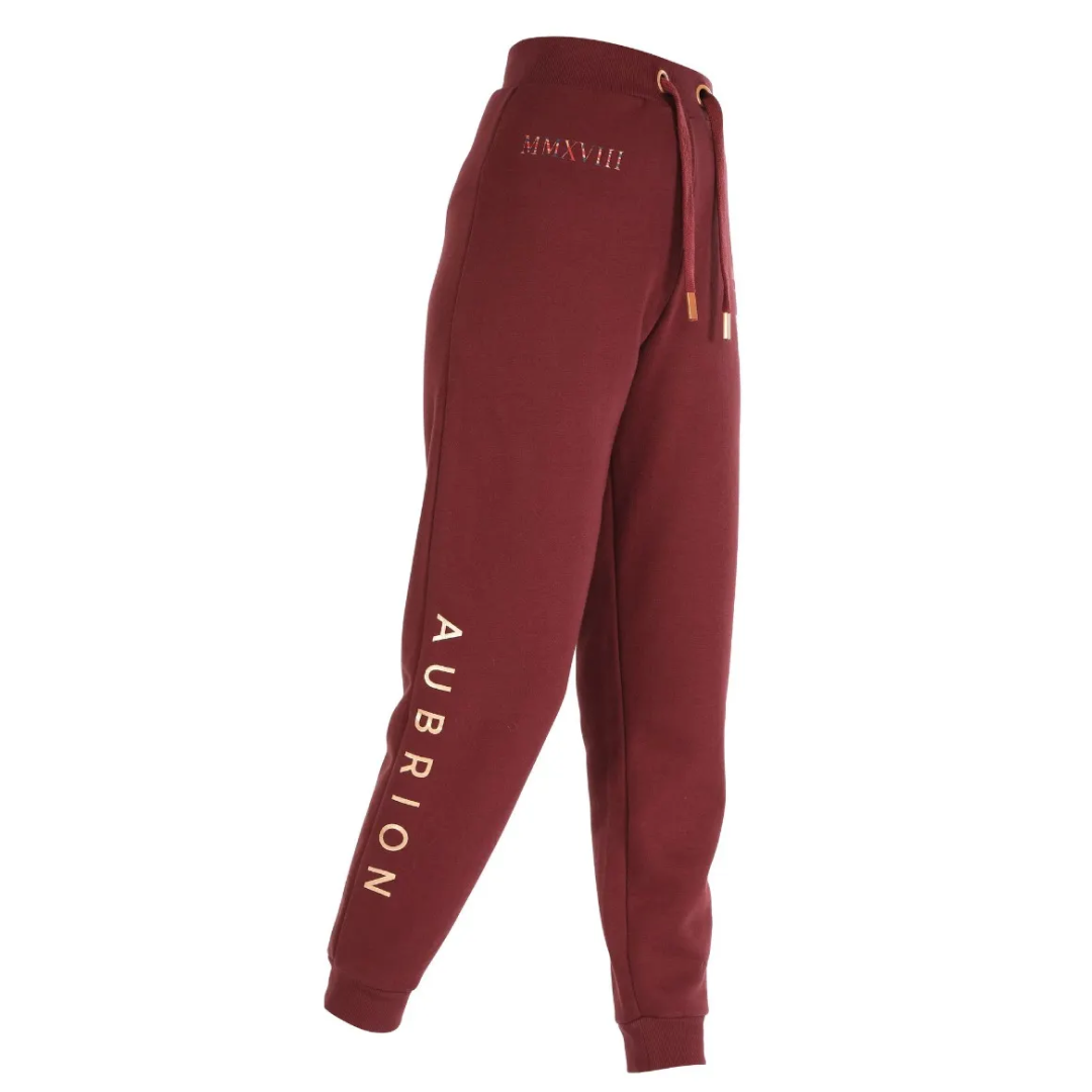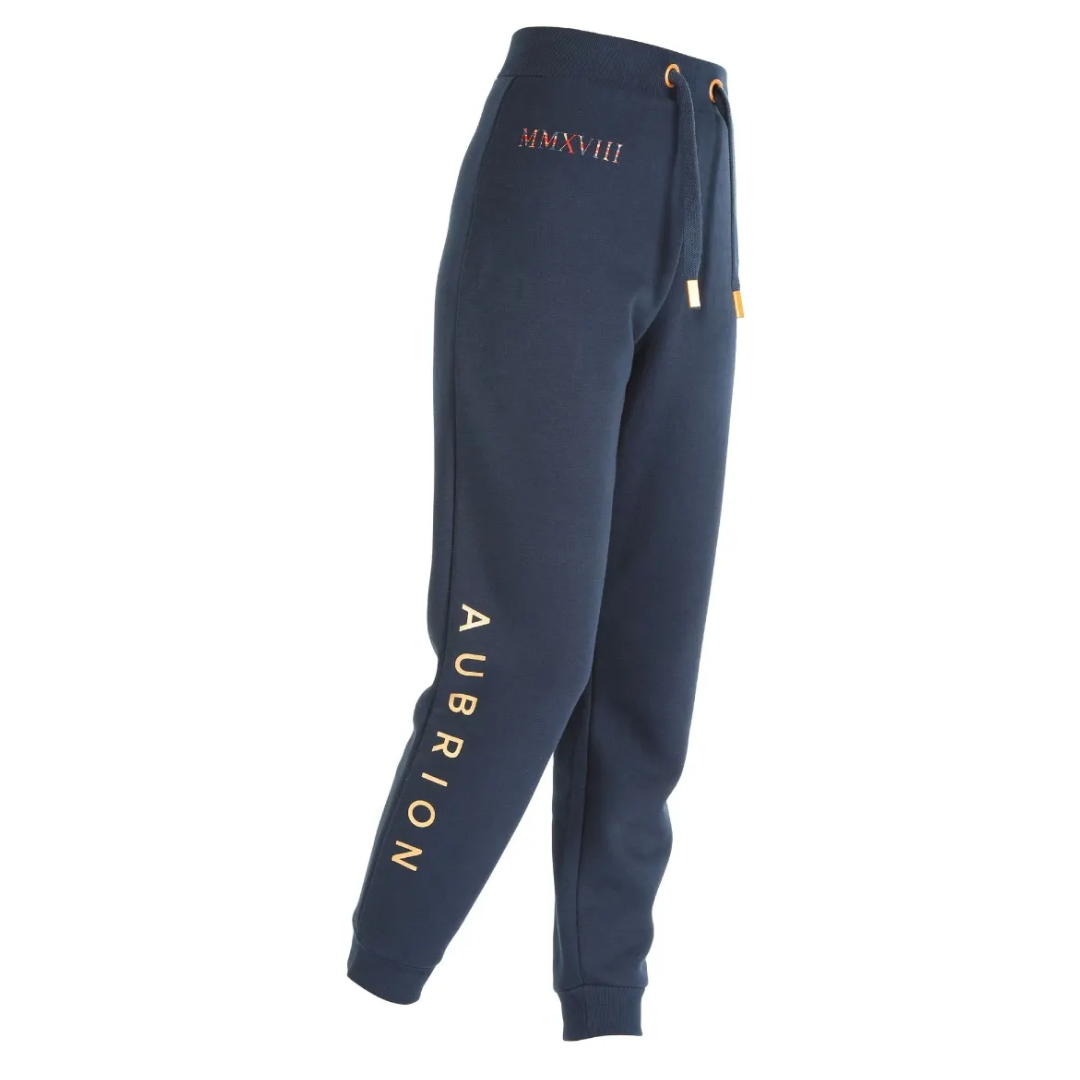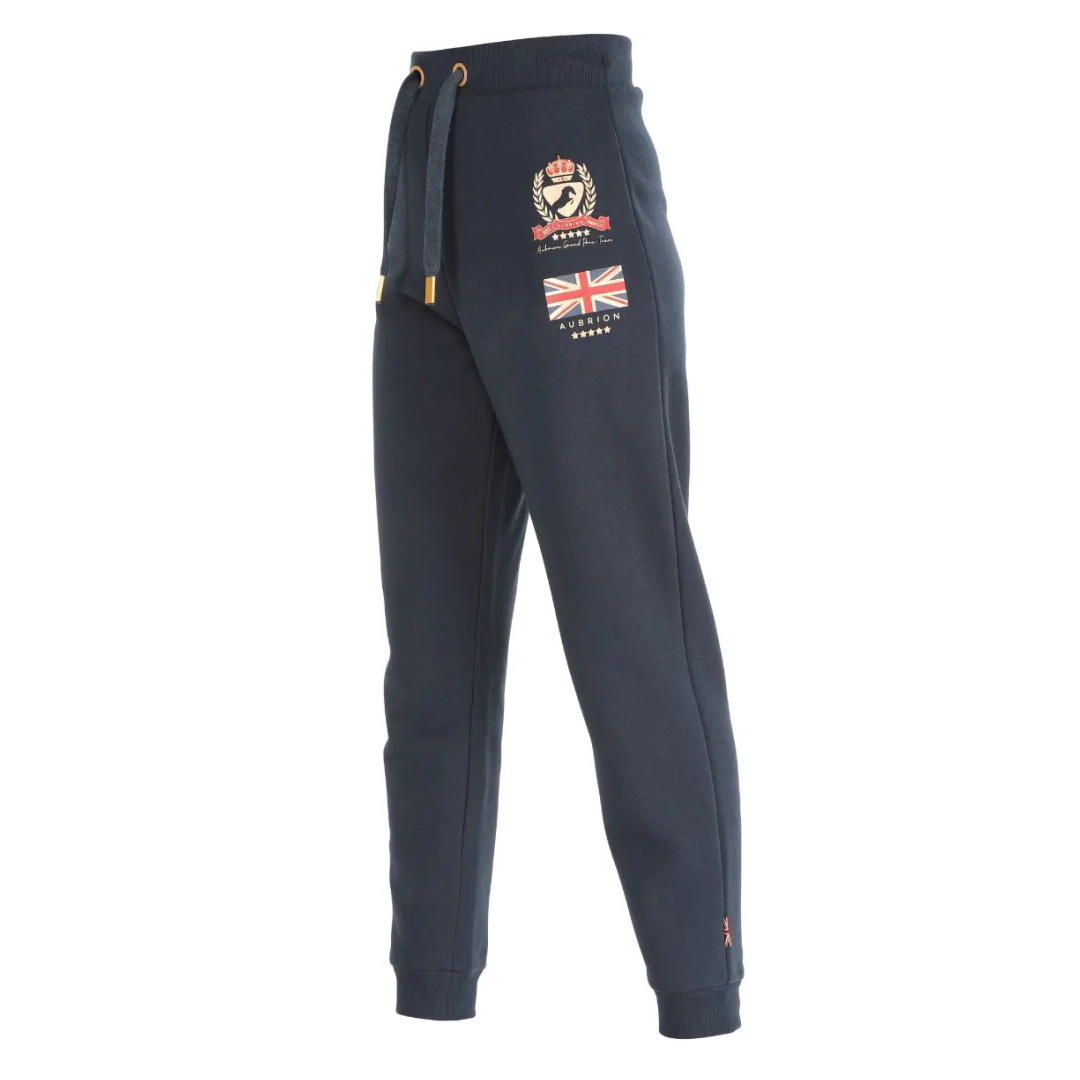 Relax in style wearing the Shires Aubrion Team joggers. Add matching hoodie for the full relaxed glamour experience. The detail: cotton rich cosy jersey with fleecy inner, gold trimmed drawcord, ankle cuffs, Aubrion Team prints.