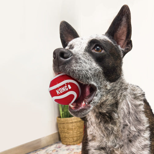 - Felt on KONG Signature Sport Ball is gentler on teeth and gums than regular tennis balls