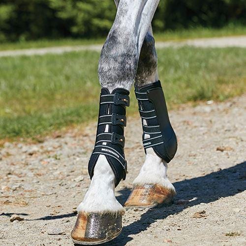 Absorbent and comfortable 3D mesh to wick away moisture and keep the leg dry while shaped perfectly to fit the horse leg, Perfect combination of fetlock support and tendon protection, Quick and easy release elastic pin closures to ensure stability