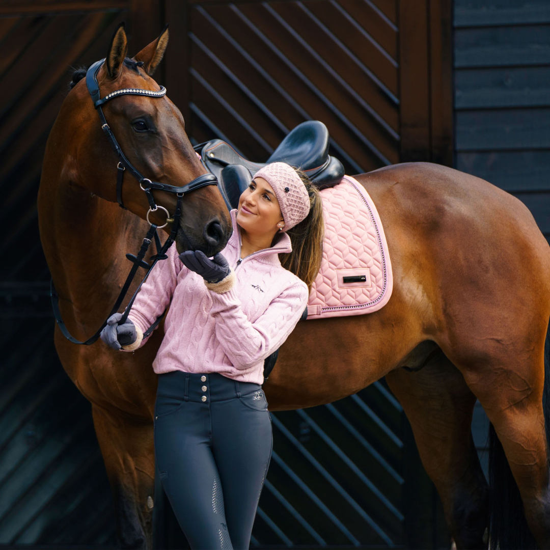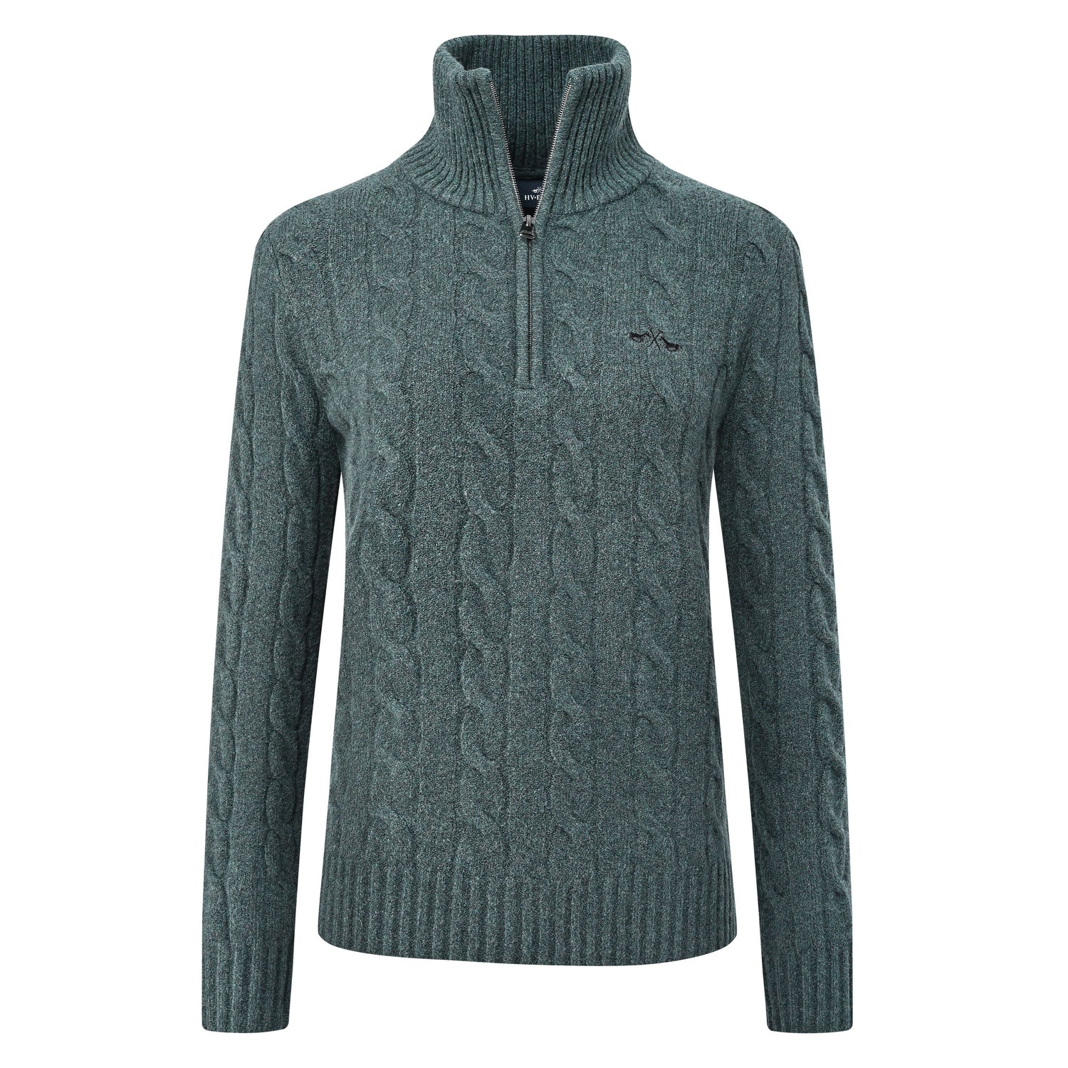 The HV Polo Dunya Pullover is a luxurious cable-knit pully that features a half zip, a metallic horse bit at the bottom hem, tonal ribbing at the cuffs and hem, and a high-standing collar with a zipper closure for a slim fit. Its chest showcases a Horse logo in alluring lurex embroidery, and the armholes are crafted with a fully-fashioned style. This unique piece is made with 33% cotton, 26% acrylic, 23% polyamide, 10% bamboo, 5% wool and 3% elastane.