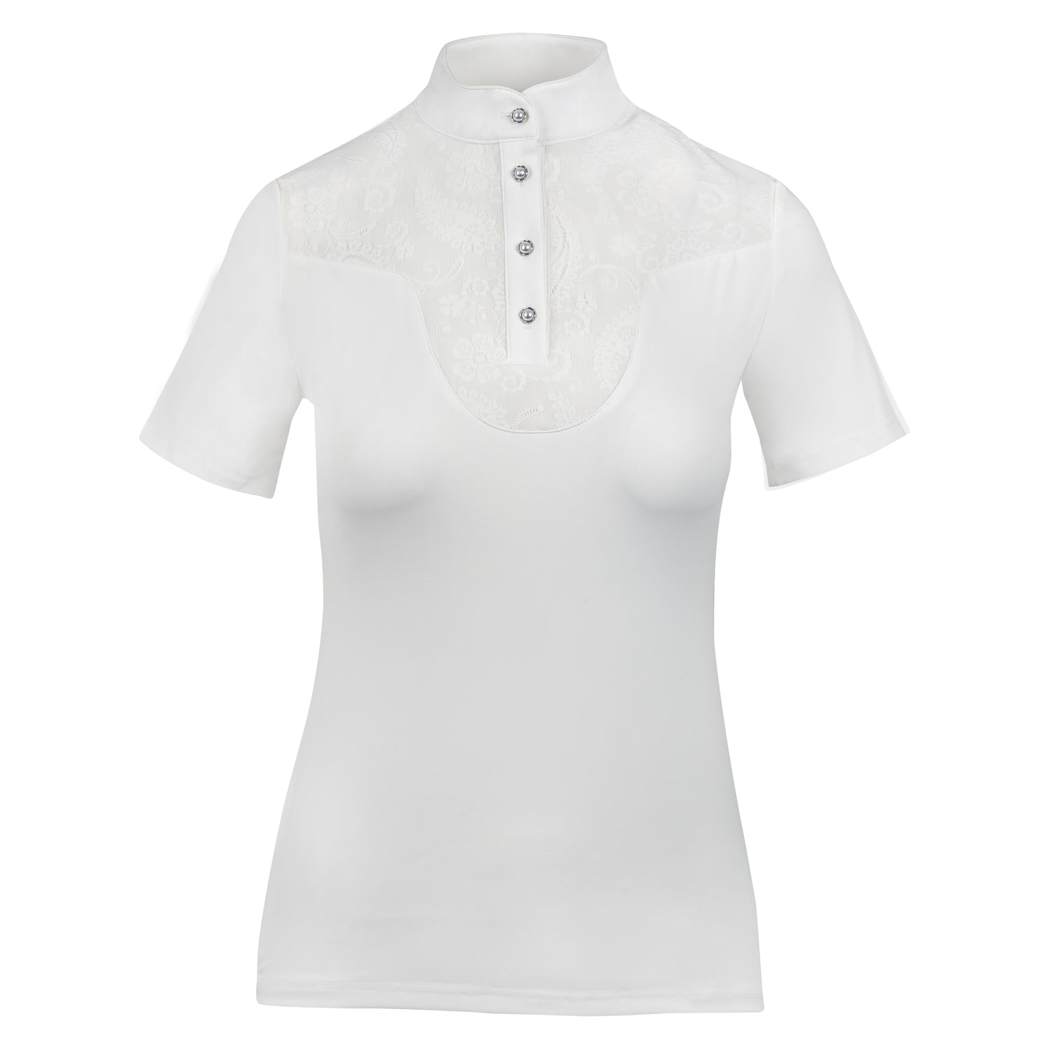 Four-way stretch material ensures exceptional freedom of movement and breathability, keeping riders fresh between classes. Elegant faux pearl buttons and a