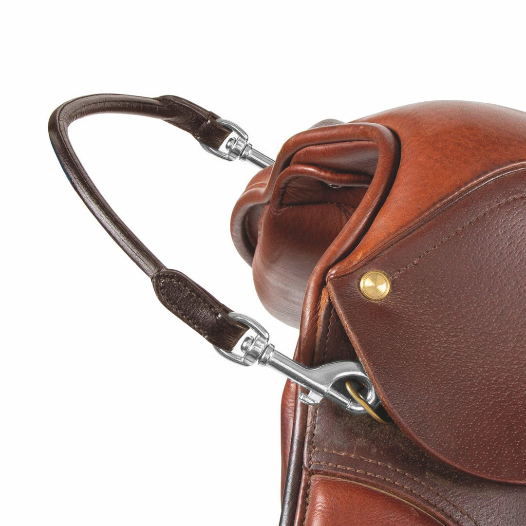 Ein nützliches Hilfsmittel für Reiter, die zusätzliche Stabilität im Sattel benötigen. Ideal für Anfänger oder gehbehinderte Fahrer, um das Selbstvertrauen zu stärken und das Gleichgewicht zu verbessern. Wird auch von erfahrenen Reitsportlern verwendet und ermöglicht eine aufrechtere Haltung. Besonders nützlich beim Reiten junger oder nervöser Pferde. Bequemer, gerollter Lederriemen mit drehbaren Auslöseclips an beiden Enden zur Befestigung an den D-Ringen des Sattels.
