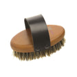Braune, ovale Körperbürste aus Holz mit gold-/schwarz-beigen Borsten und einem Lederband.