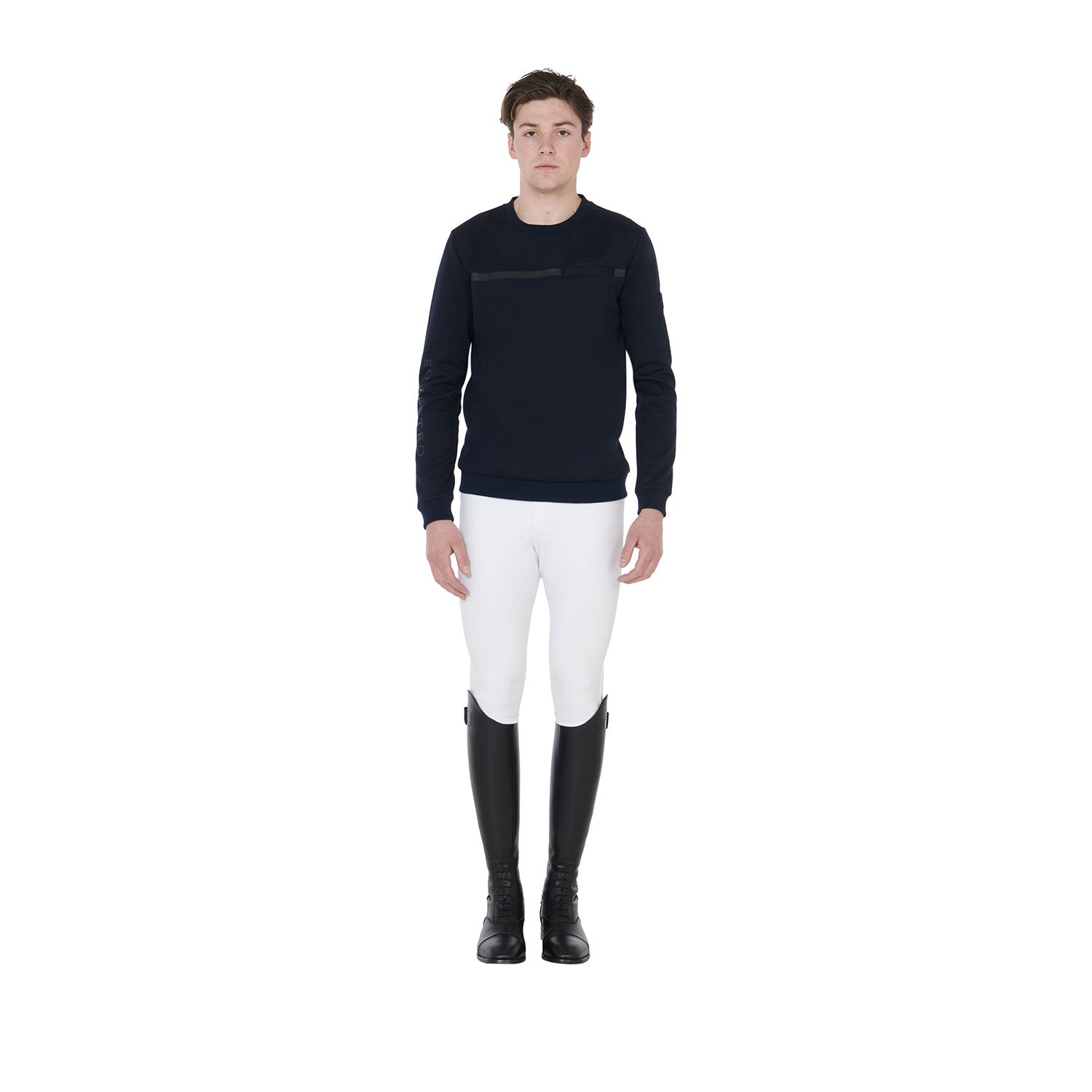 Stay comfortable and stylish with the Equestro Men's Interlock Crewneck Sweatshirt. Crafted from breathable interlock technical fabric, it offers full freedom of movement, ideal for both daily training and casual wear. Featuring elasticated cuffs and waistband for a snug fit, a zippered chest pocket with a distinctive yellow puller, and bold Equestro branding along the right arm and left shoulder, this sweatshirt combines functionality with modern design. Perfect for autumn and spring, it’s your go-to choice for versatile, comfortable performance.