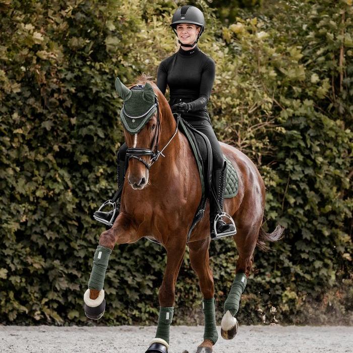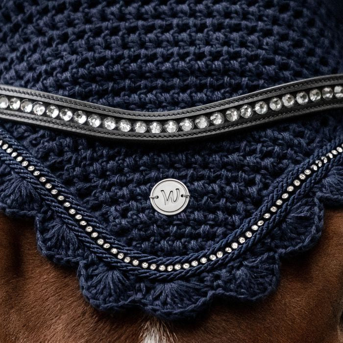 High-quality fly veil with elasticated ears, matching our Nepal collection. A metal plate and a shimmering rhinestone band between two tonal decorative cords ensure an elegant appearance.