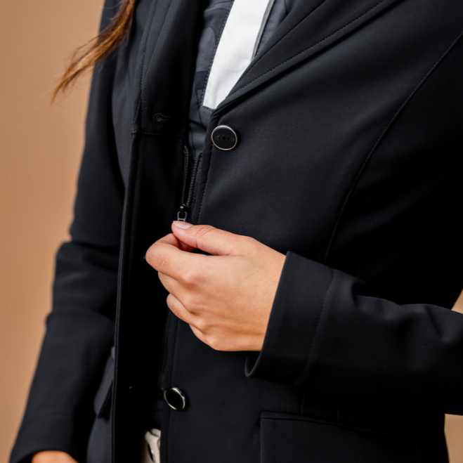 This elegant high-performance competition jacket combines sophistication with functionality, making it ideal for riders across disciplines. Designed to be highly breathable and supremely lightweight with no lining, it ensures comfort without compromise. The anti-pilling, wrinkle-free 4-way stretch fabric provides durability and ease of movement, while the UPF 50+ sun protection treatment adds extra performance benefits. Featuring an interchangeable button closure, practical flap pockets with zips, and a tailored silhouette with signature AA detailing throughout, this jacket delivers both style and versatility. Finished with quick-dry fabric, it’s the perfect balance of refinement, comfort, and convenience.
