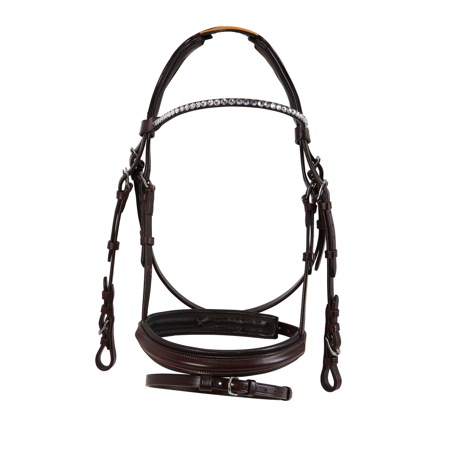 The Acavallo Cupido Bridle Calfskin offers exceptional comfort and style with its premium Italian calfskin construction. Its anatomically shaped headpiece with lateral latex padding reduces pressure on the skull, ensuring your horse’s comfort during rides. The adjustable noseband and sparkling browband add both practicality and a touch of elegance. Finished with sturdy stainless steel buckles, this bridle delivers lasting quality and refined sophistication for discerning riders.