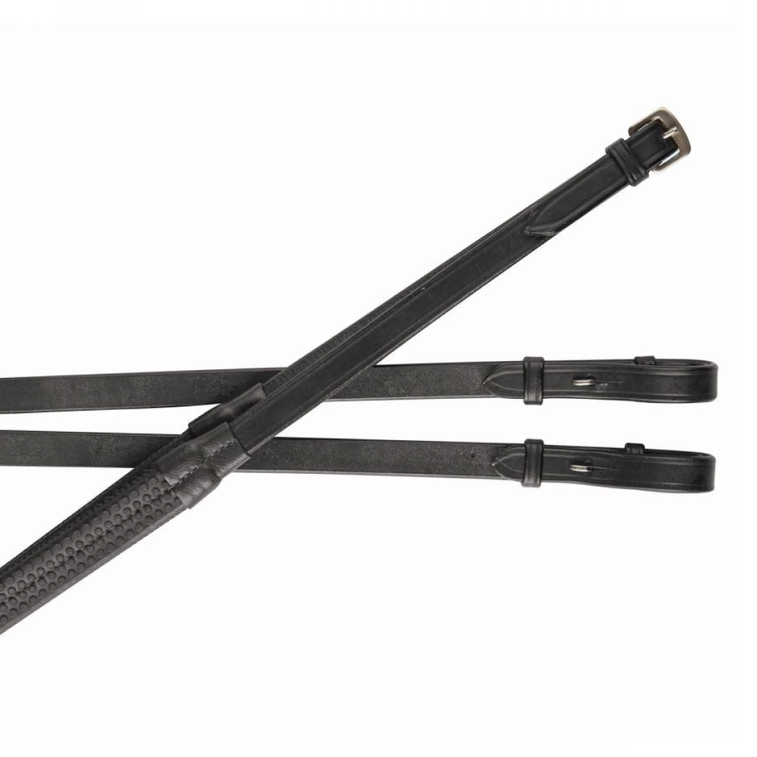 - Diese Zügel haben einen Einsatz aus feinstem europäischen Leder unter dem Gummi.