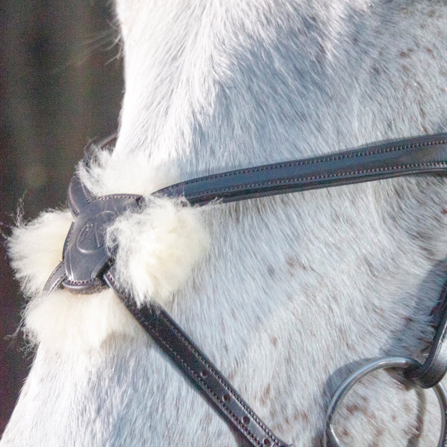 The throat lash strap has been strategically integrated into the headpiece to reduce the bulk in the sensitive TMJ area and allowing for the noseband and cheek piece buckles to lie flat against the horses skin.