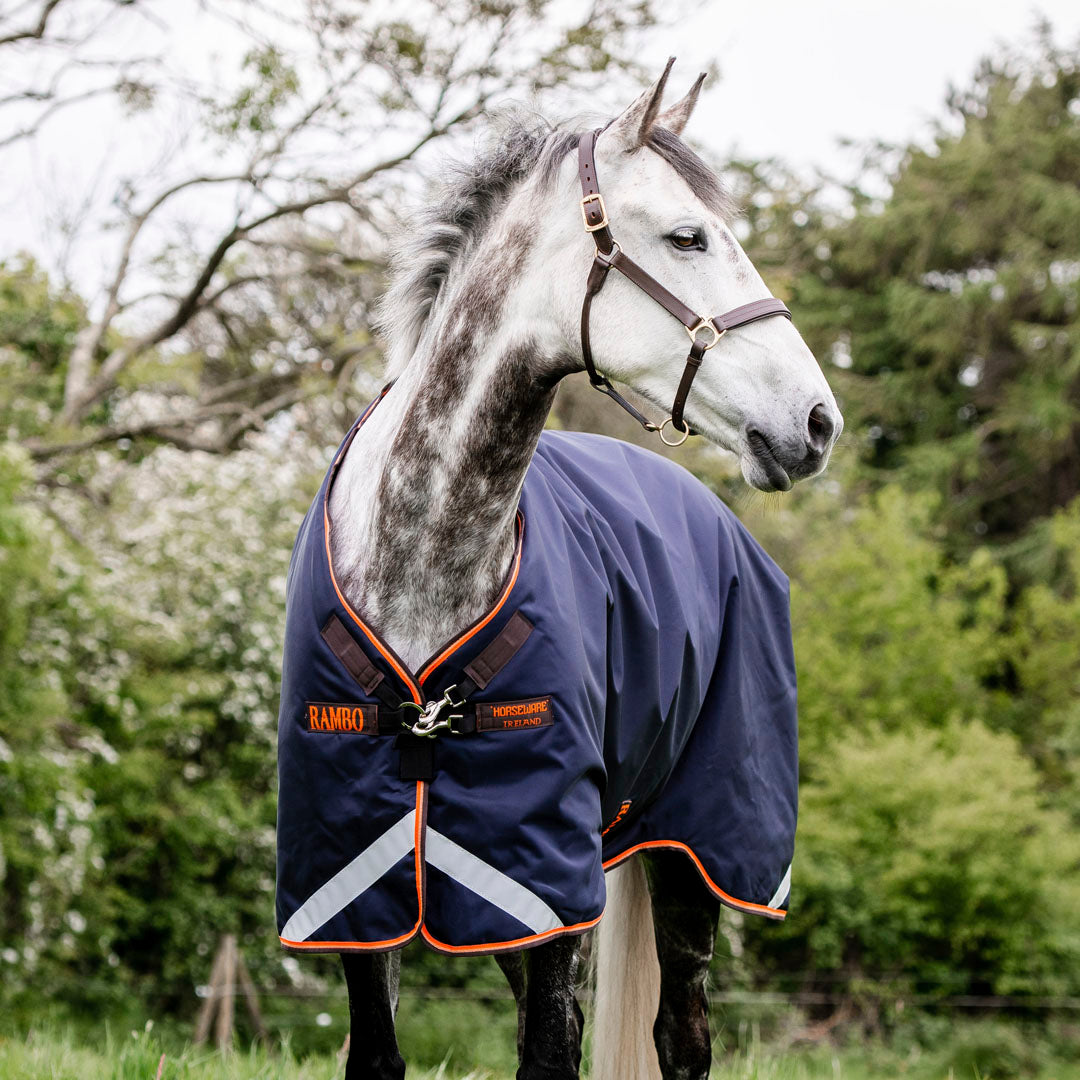 Horseware Ireland Rambo Original 100g Weidedecke mit Beinbögen - Marineblau/Orange/Hellbraun/Braun / 5'6 ist auf Lager und wird versandt, sobald es wieder verfügbar ist