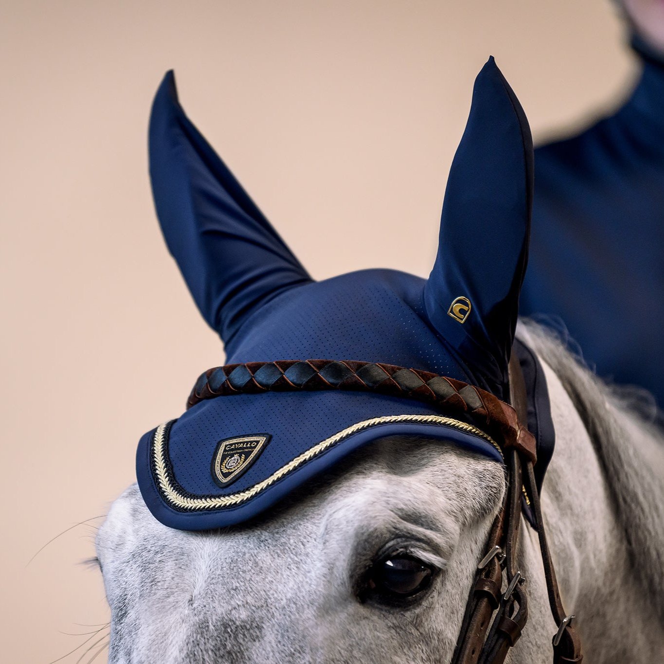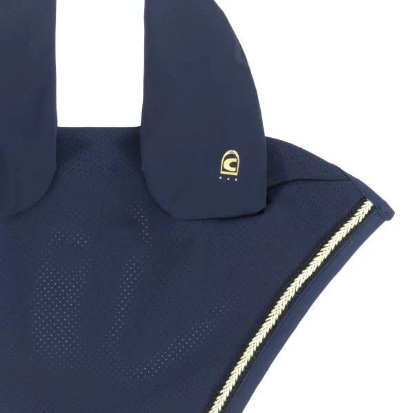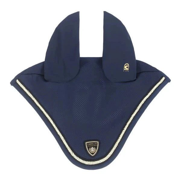 The Cavallo Lydia Fly Veil utilizes quick-drying, odor-neutral, and skin-friendly functional jersey material. Its head area is perforated, and the left ear features a printed Cavallo stirrup logo. The fly bonnet ears are framed by a black tape with a gold-color contrast.