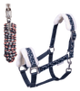 Set consisting in halter of cute all-over print and tricolour lead rope. The halter is padded with fur in the nose and neck area.