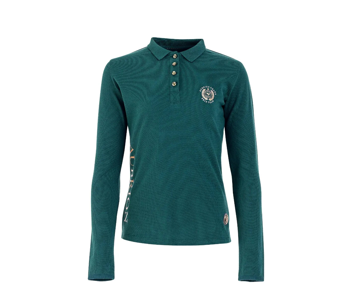 Aubrion Team style has a glamorous feel in the long sleeve polo. Constructed in cotton pique for breathable comfort, the shape is relaxed with a collar and enamel button front for a smart finish. Long sleeves are neatly trimmed with an Aubrion embossed stretch binding.