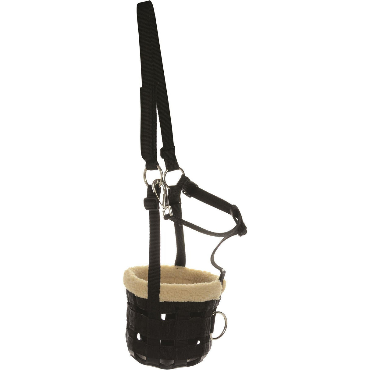 Une muselière en nylon doux et antidérapant avec un rembourrage supplémentaire en polaire à l'intérieur pour éviter les plaies sur le museau du cheval. Doté d'une base en caoutchouc, d'une double fermeture auto-agrippante sur la têtière et d'un clip sous la gorge pour un ajustement facile et une plus grande stabilité. Il y a aussi un anneau pour attacher une longe. Une façon plus douce de réduire la consommation de vos chevaux.
