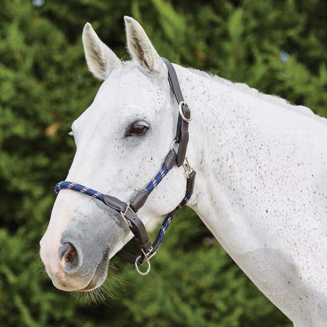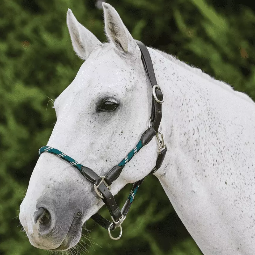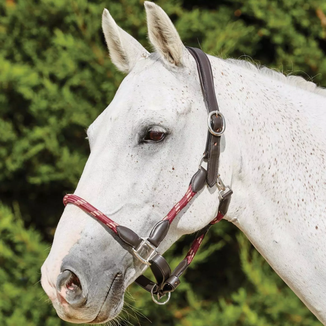 Ce licol en cuir et corde s'ajuste facilement sous le nez et sur le casque grâce à un bouton-pression rapide au niveau de la gorge.