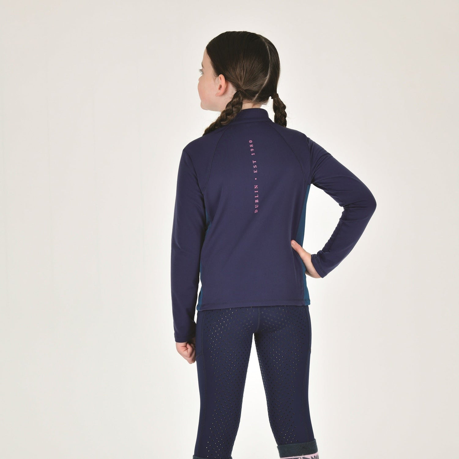 The Dublin Kids Sadie Panel Detail Long Sleeve Riding Top is a versatile and breathable riding top that is perfect as a stand alone piece or for layering through the change of seasons in to the cooler days. This warm childs riding top has a brushed inner thermal fabric for additional warmth made from a Comfort Dry Technology fabric that provides moisture control to keep you comfortable no matter what the weather as well as contrast colour perforated mesh side panels. This shirt features a stand up collar with quarter zip placket in a semi fitted style. Dublin silicon print branding on the left chest and centre back.