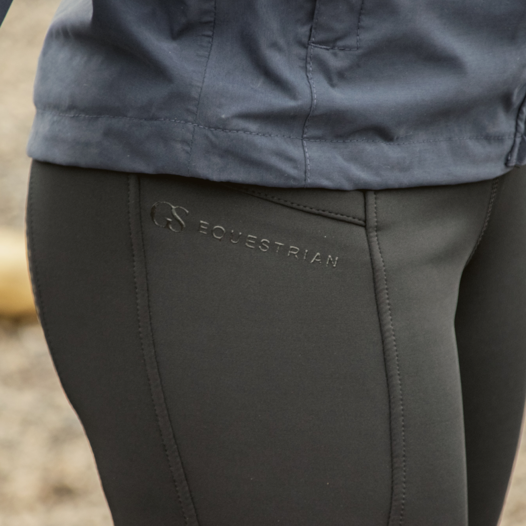 Il y a deux grandes poches, une située sur chaque jambe, qui peuvent facilement contenir un téléphone ainsi que d'autres effets personnels. Une caractéristique est réalisée à partir des poches en les bordant de coutures ainsi qu'en ayant un logo GS Equestrian en silicone sur la poche droite du téléphone.