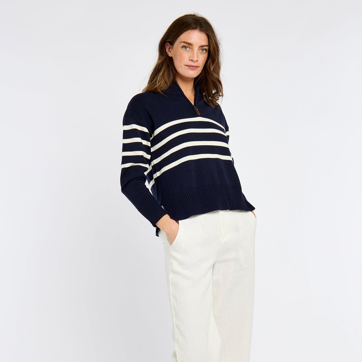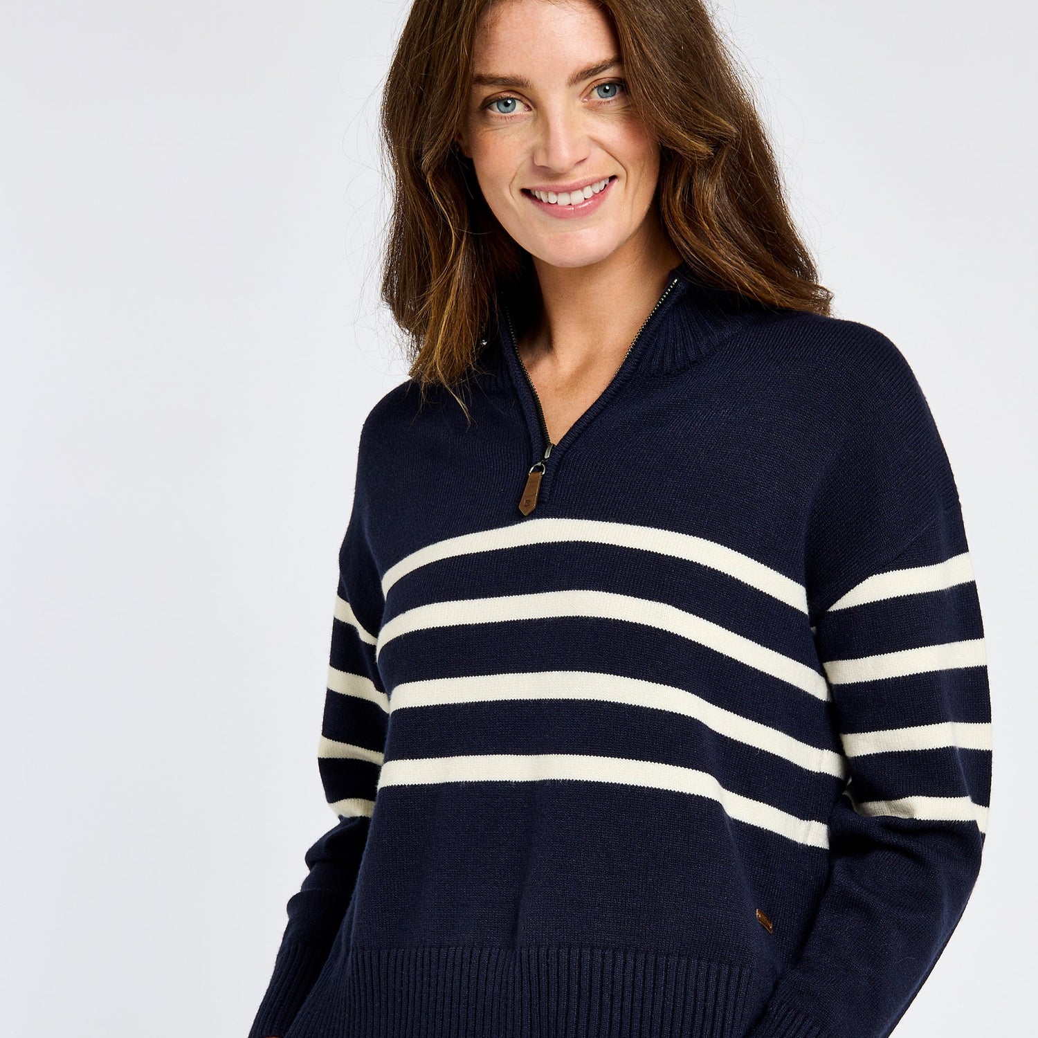 The Dubarry Fonthtill sweater is lightweight and wonderfully soft, made with a combination yarn designed to be soft to the touch, hold its shape well and be machine washable. The crisp contrasting stripes have a distinct nautical feel, very at home by the sea, but bring a fresh spring touch wherever you take it. The ribbed collar can be zipped up or down giving you a light spring layer that’s also cosy on cooler spring evenings.
