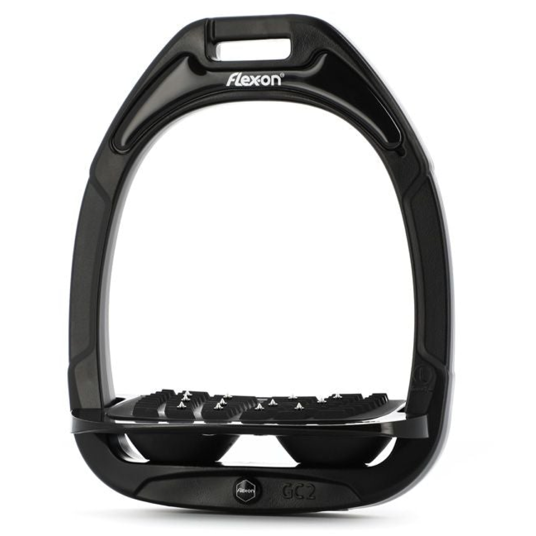 Les étriers comportent une assise plantaire inclinée selon un angle pour correspondre à la position naturelle du talon du cavalier, avec de petits crampons en acier trempé intégrés dans la bande de roulement ultra-adhérente pour empêcher la botte du cavalier de glisser. La conception innovante du cadre et de la semelle intérieure vous aide à obtenir une position idéale des jambes, une stabilité optimale et réduit le stress et la tension sur les articulations de la hanche, du genou et de la cheville. L'étrier Flex-On est également équipé de deux ressorts sous la semelle intérieure pour réduire et absorber les ondes de choc, améliorant ainsi le confort et réduisant les tensions.