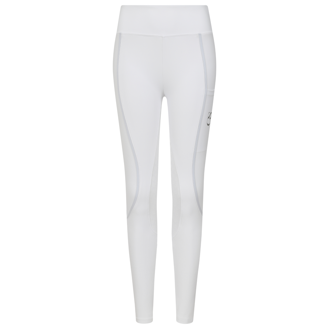 La poignée en silicone à motif « GS » est nouvelle dans la gamme GS Equestrian et offre un look élégant, tout en étant efficace. Étant un collant d'équitation à fond intégral, le silicone est coloré de la même couleur que le collant d'équitation, ce qui se fond dans le design élégant, car il recouvre une grande partie du collant d'équitation. De plus, il y a un logo GS sur la jambe gauche, situé sur la poche du téléphone, qui a une touche réfléchissante.