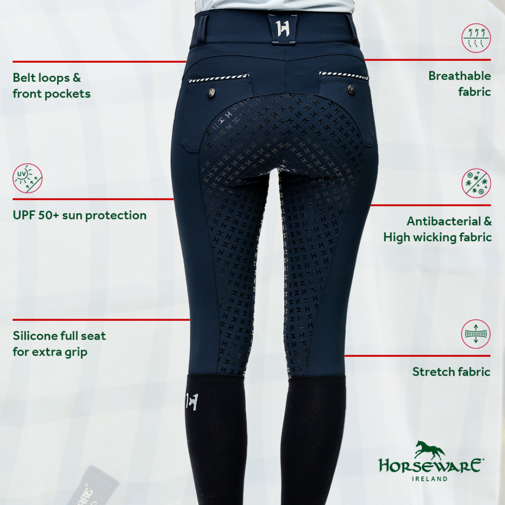 This piece is crafted from premium double-bonded fabric for a soft, supportive feel, while its 4-way stretch construction provides exceptional freedom of movement. Its high-rise waist with optimum shape retention ensures a flattering, sleek silhouette, and the UPF 50+ rating provides reliable sun protection. Highly breathable and functional, the fabric also features antibacterial and high-wicking properties to keep you fresh and comfortable all day. For added performance, the silicone full seat enhances stability and control, while thoughtful details like two front pockets with Newmarket trim, faux back flap pockets with button accents, and a durable double hook-and-eye button closure with belt loops combine style and practicality.