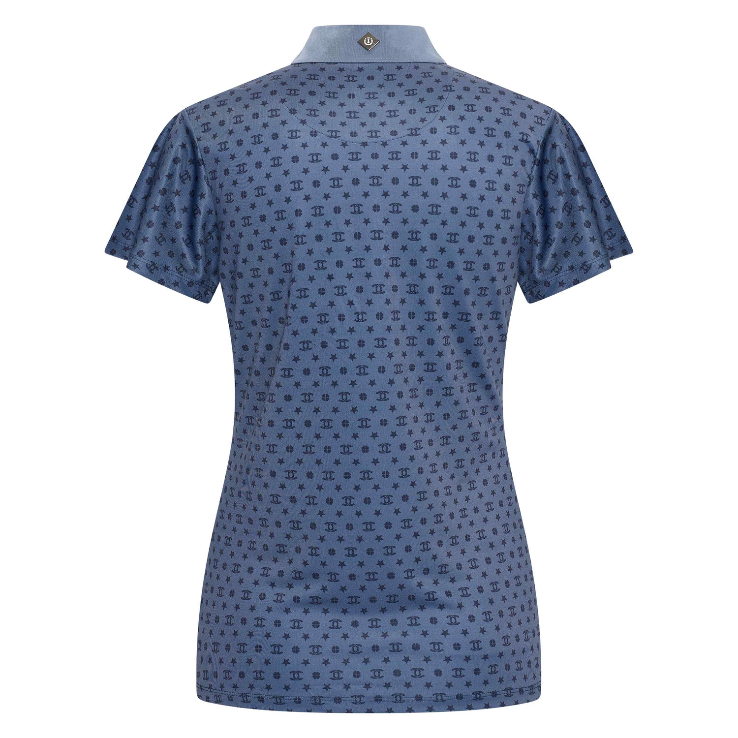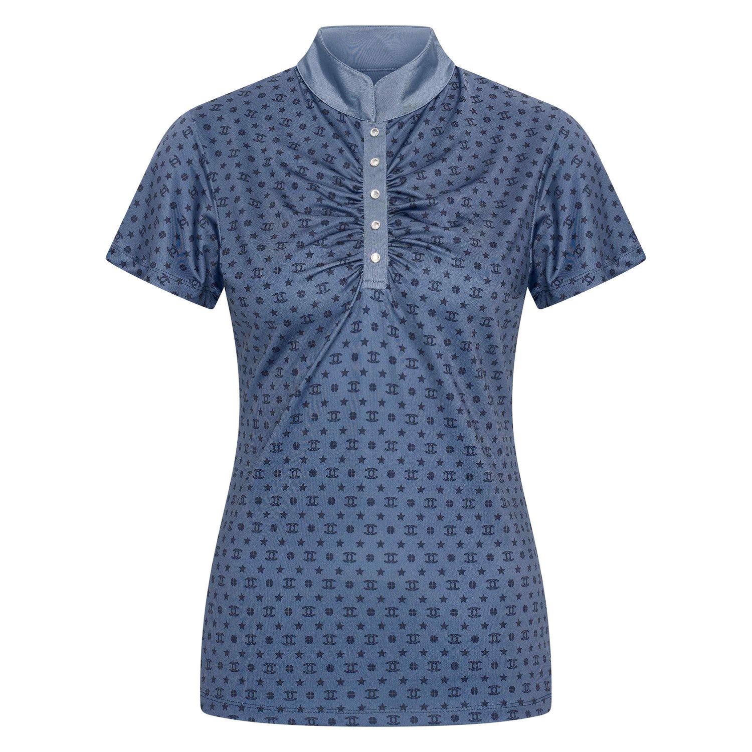 Introducing Imperial Riding's Children's Roxy AOP Tech Top, the perfect blend of style and functionality. Made with printed fabric and adorned with crystal buttons, this jersey top features flared short sleeves and gathering next to the placket for added flair. Show off your equestrian style with the Imperial Riding horse shoe at the collar centreback.