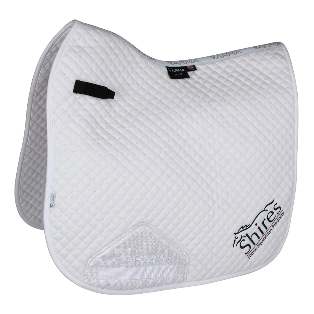 Le tapis de selle de dressage de marque Shires est intelligemment marqué et utilisé par l'équipe #shiresprorider. Extérieur respirant et anti-boulochage 100 % coton. La doublure ULTRA DRI ZONE évacue instantanément la transpiration du cheval pour réduire les risques de frottements et augmenter le confort. Guides de sangle et sangles élastiques avec anneau en D pour une sécurité pratique. Contre-sanglons résistants.