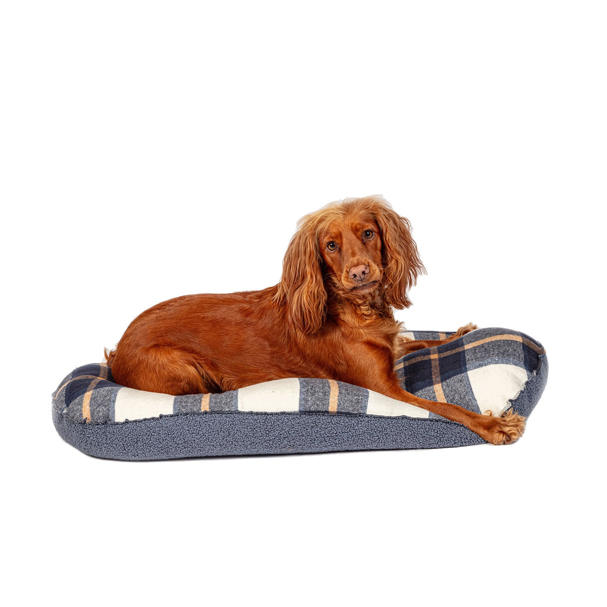 A navy brushed check with tan highlights featuring a petrol blue-grey loop knit boucle fabric on the reverse. The mattress is filled with a soft and fluffy polyester fibre filling which provides a lot of warmth and comfort.