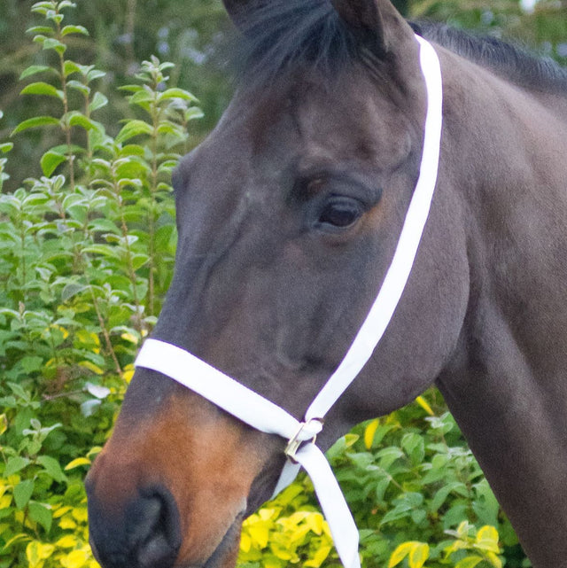 Beautiful traditional white webbing show halter with solid brass fittings. Fully adjustable to fit foal to full size. 100% soft tubular 1 " (25mm) cotton web. Generous lead length (Total length 3.5 metres) with looped end. Used for in hand showing and compliments the horses head beautifully.