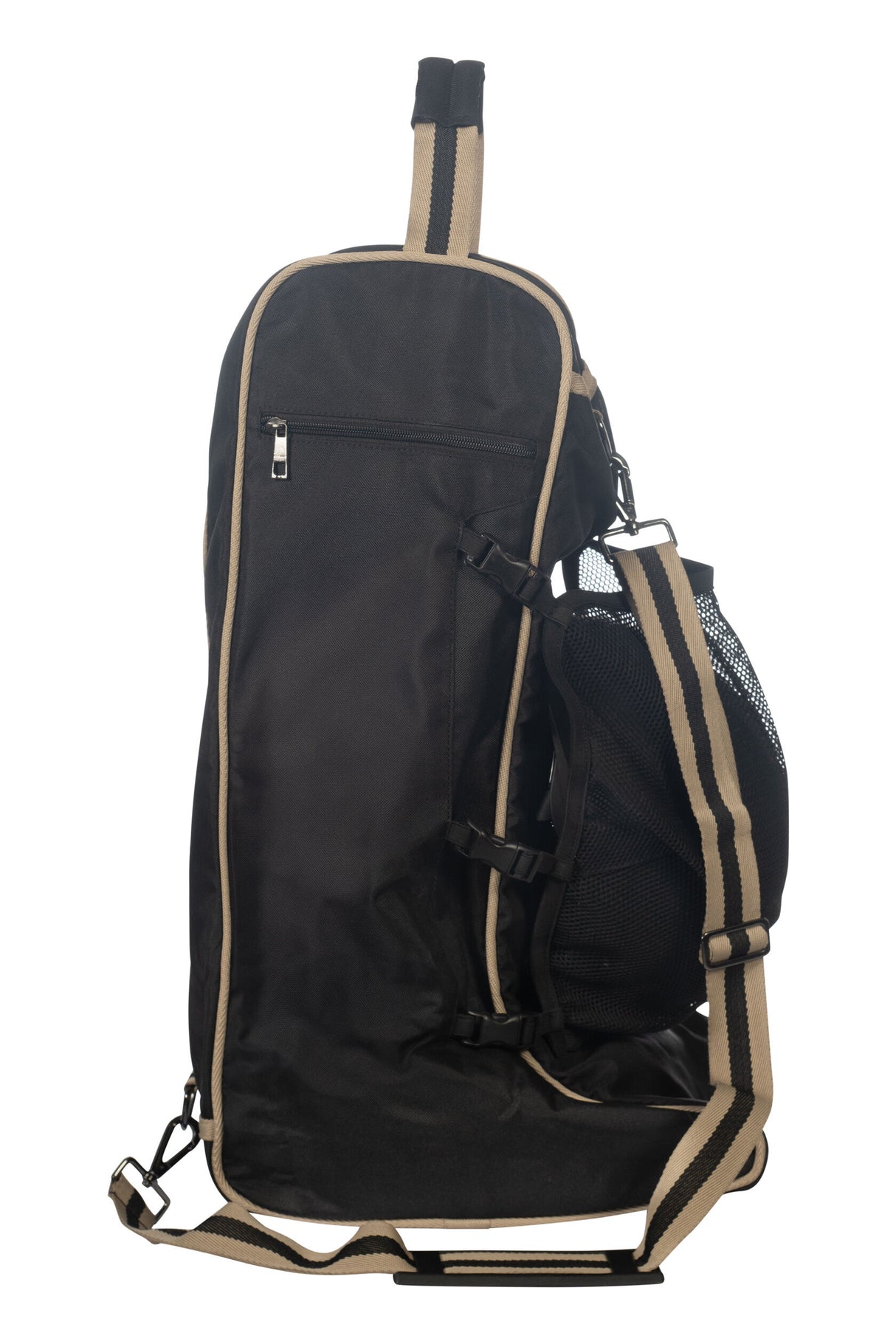 The HKM Boot Bag -Joules- is designed with a reinforced bottom for durability and a removable shoulder strap for convenient carrying. Its outside pocket provides extra storage space, while the handle makes it easy to transport. With an attachable net, it also offers the option to carry your helmet. Expertly crafted for effortless transportation.