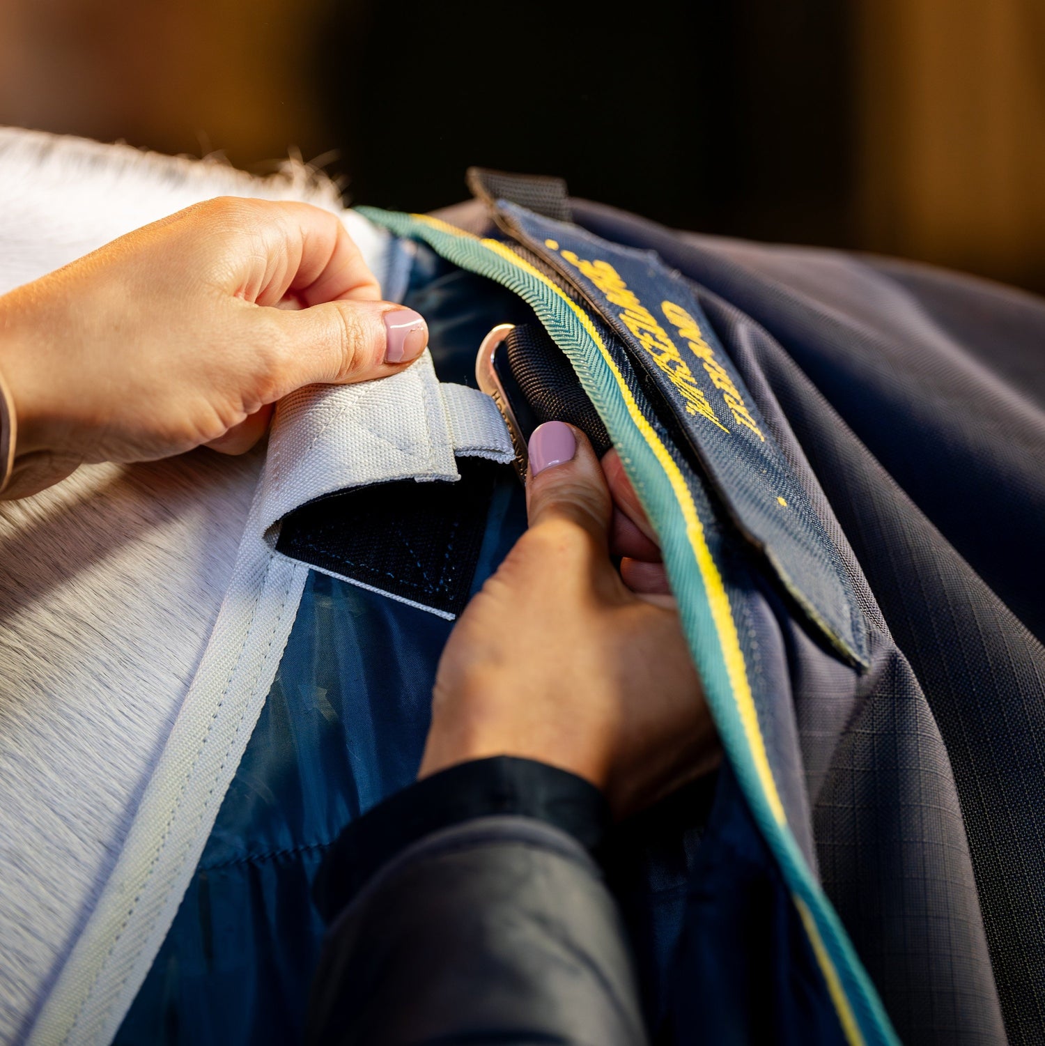 La fermeture en V sur le devant, la conception du cou Surefit et les deux arcs de jambe éliminent la pression autour des épaules et offrent un confort prolongé pendant le pâturage. Les trois sursangles croisées intègrent notre système de sursangles de sécurité Rambo®, qui peut résister à 100 kg de pression, mais se relâchera si votre cheval est dangereusement happé - une protection supplémentaire pour votre cheval, une tranquillité d'esprit supplémentaire pour vous.