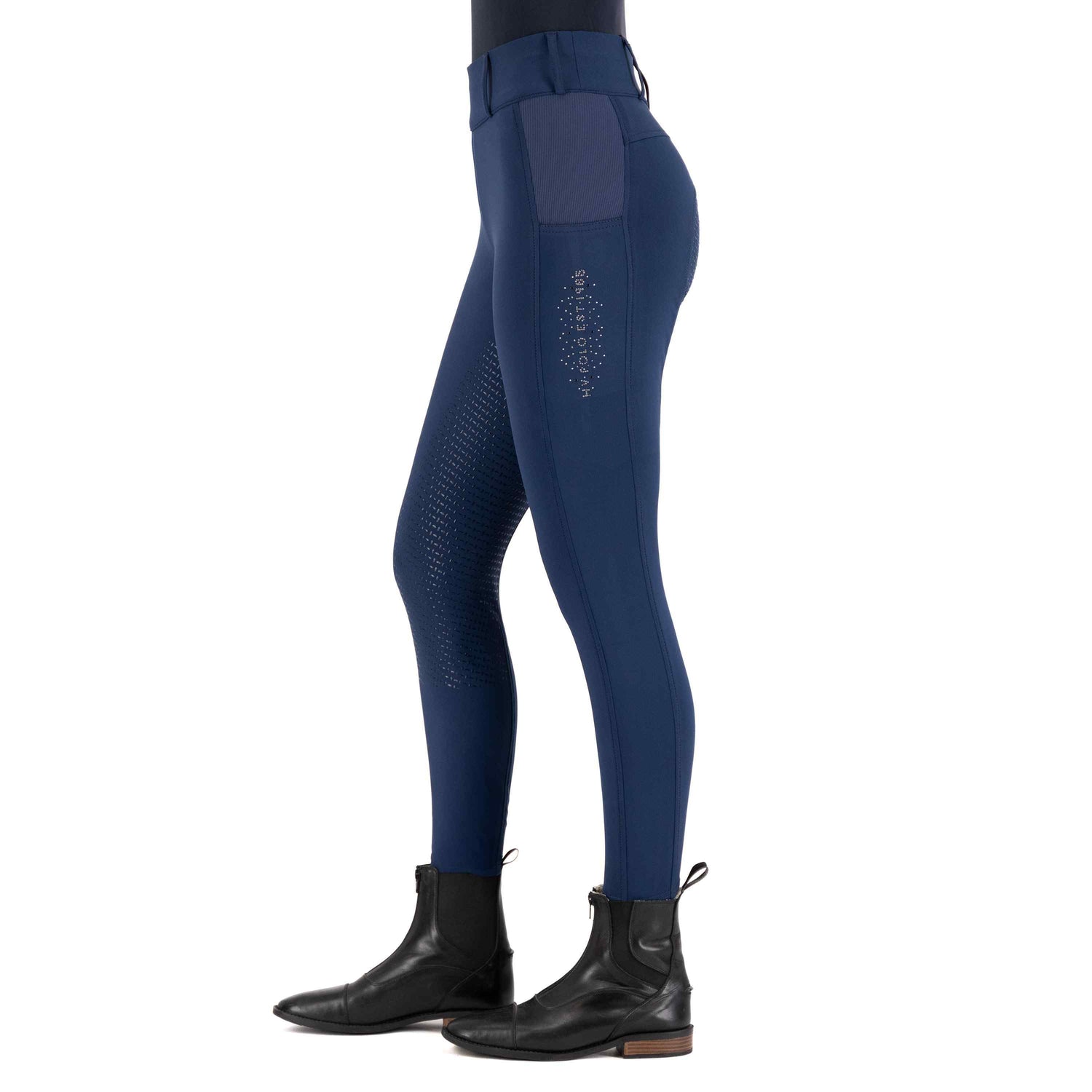 The HV Polo Evi Full Grip Riding Tights are crafted from eco-friendly recycled polyester fabric, showcasing a commitment to sustainability. The ribbed parts on the upper side add a touch of texture to these stylish tights. Designed with a wide elastic waistband featuring belt loops, they provide a comfortable and secure fit.