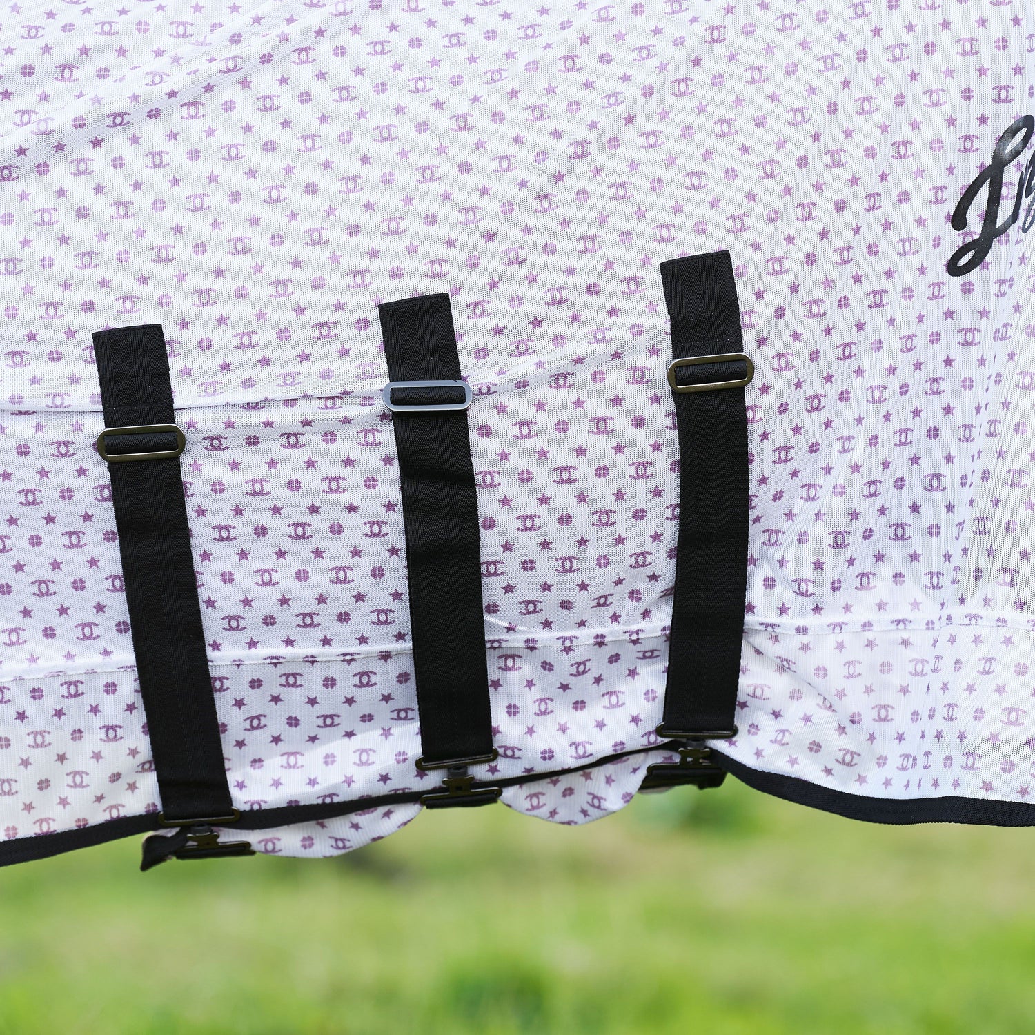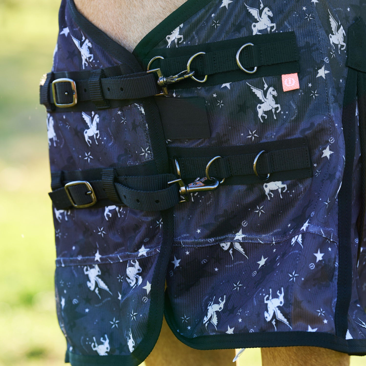 The flyblanket is made of fine mesh in IR designed prints.The blanket protects the horse against mosquitoes and flies and prevents the horse being discolored by the sun. With nylon lining on the shoulder and the manes, gusset and chest closure with velcro and buckle closure. The adjustable belly flap has three torque fasteners. Furthermore, the blanket has an extra long tail flap with tailstrap and elastic leg straps. TIP! Did you know that especially this funny print keeps the flies away? They even get drunk by the effect of the print.