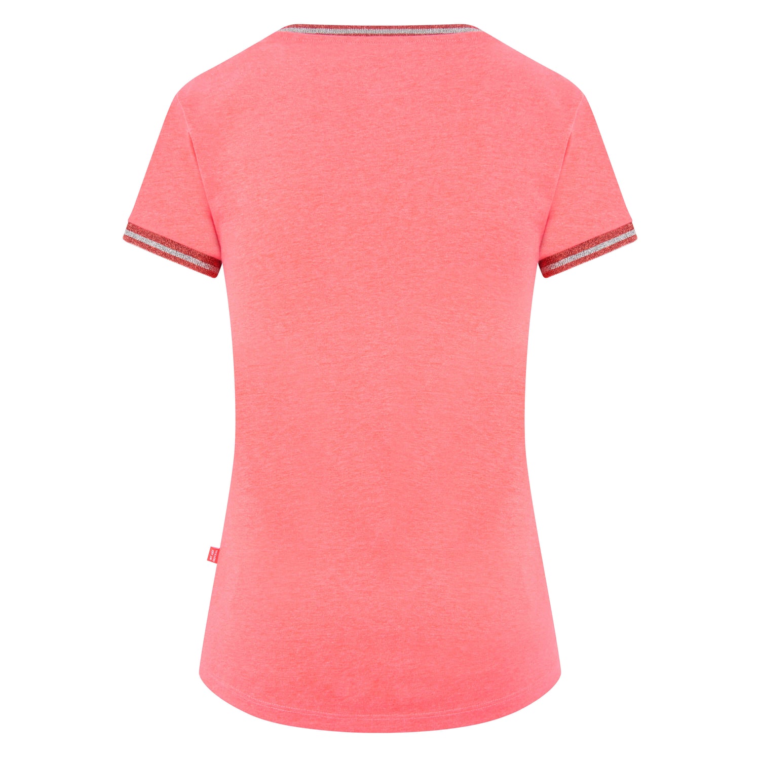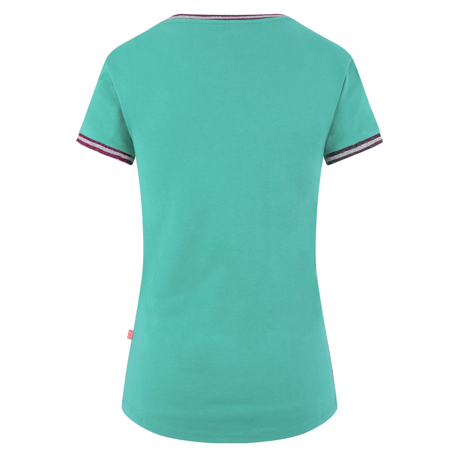 T-shirt à col rond avec bordures de col et de manches de couleur contrastée. Avec une jolie illustration en caoutchouc avec des paillettes sur le dessus. Avec des étiquettes de marque sur la couture latérale et sur la manche et un imprimé fantaisie sur le cou.