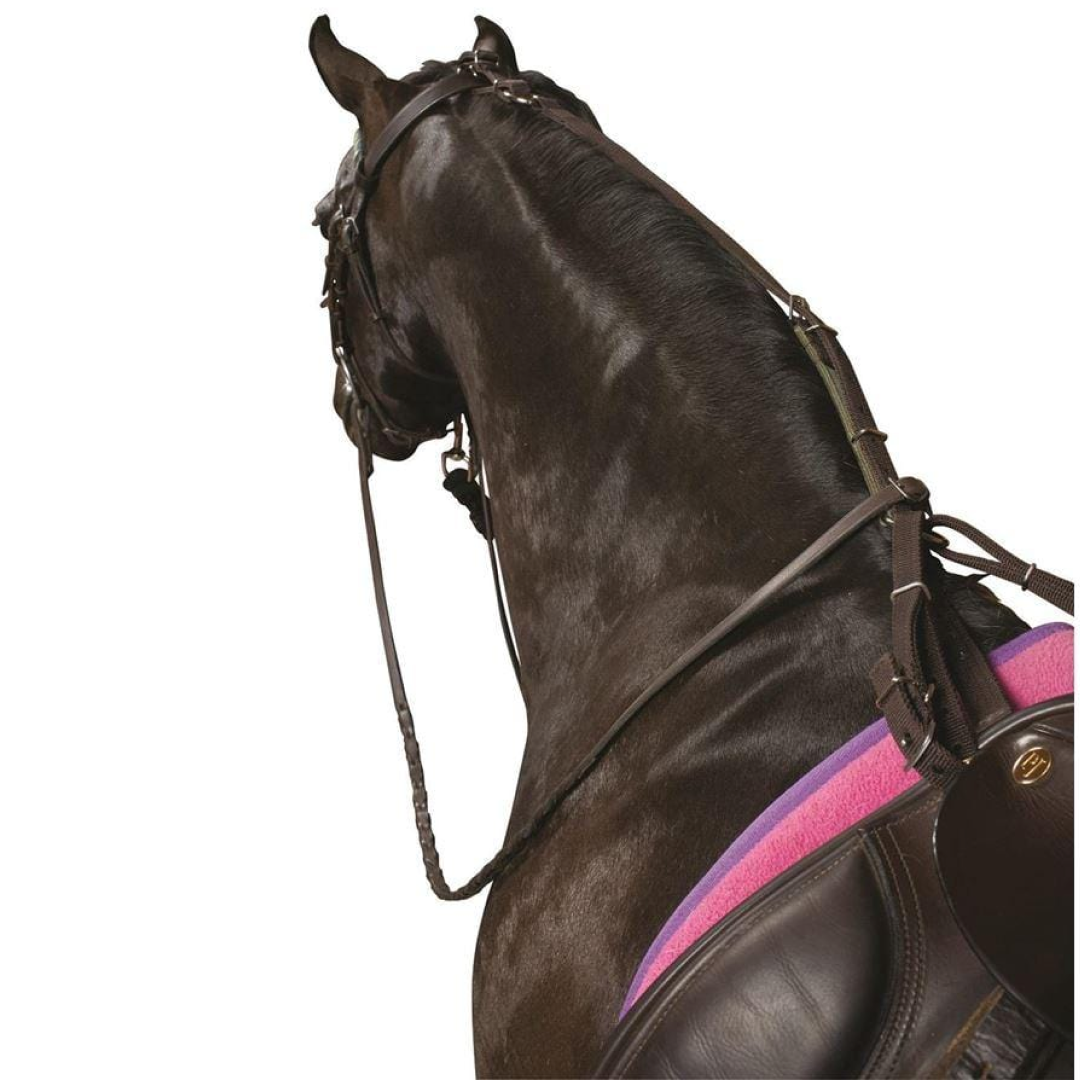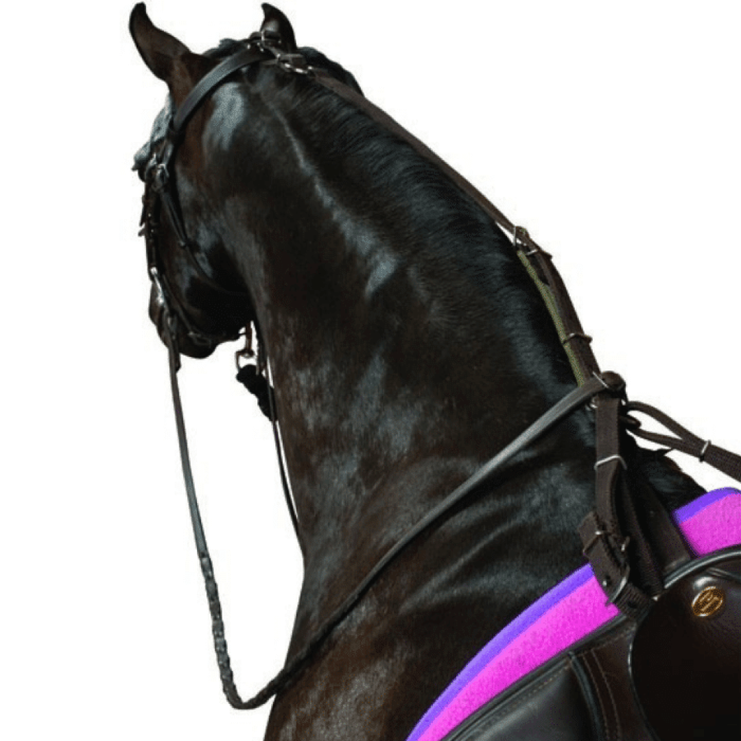 - Des sangles réglables s'étendent des anneaux en D de la selle jusqu'à la couronne de la bride, empêchant le cheval de s'étirer la tête au-delà d'un certain point.