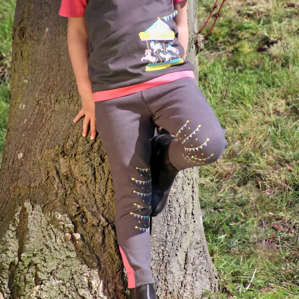Pull on jodhpurs designed for a comfortable and secure fit allowing your child to enjoy riding and spending days down the yard. Silicone knee deign finishes the look but also offers extra grip in the saddle. Pair these grey and pink jodhpurs with the Merry Go Round t-shirt and jacket to take your matching riding outfit to the next level.