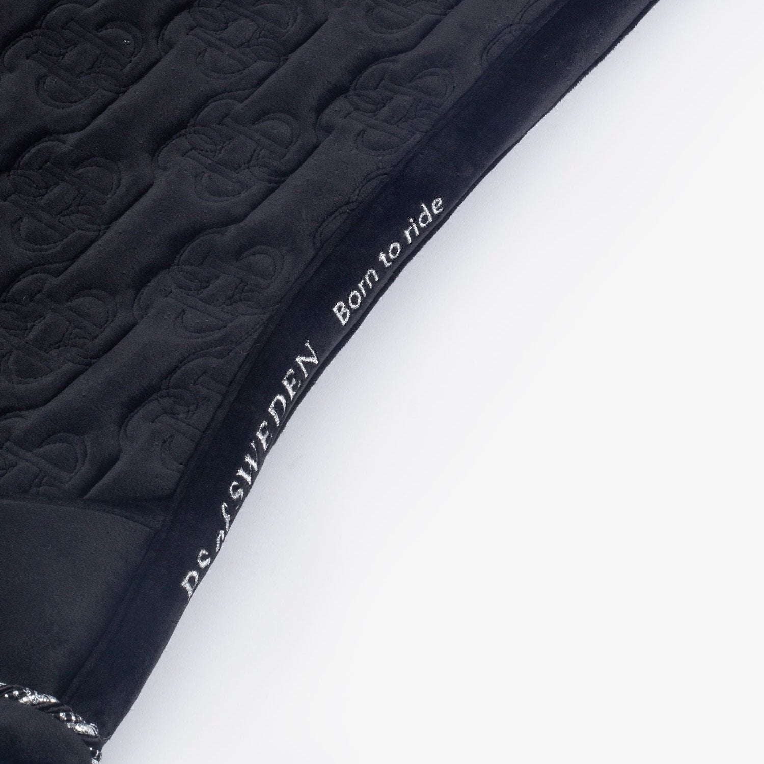 New monogram quilt on a luxurious velvet fabric with 3 colour lollipop and solid lollipop binding. Covered girth tunnel and metallic gold or silver quote on the spine. Complete the look with polos and fly hat from Velvet Monogram Collection.