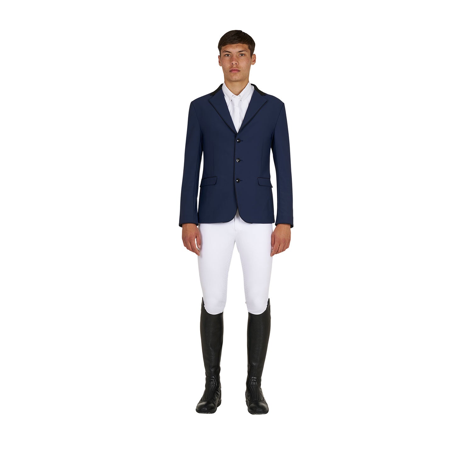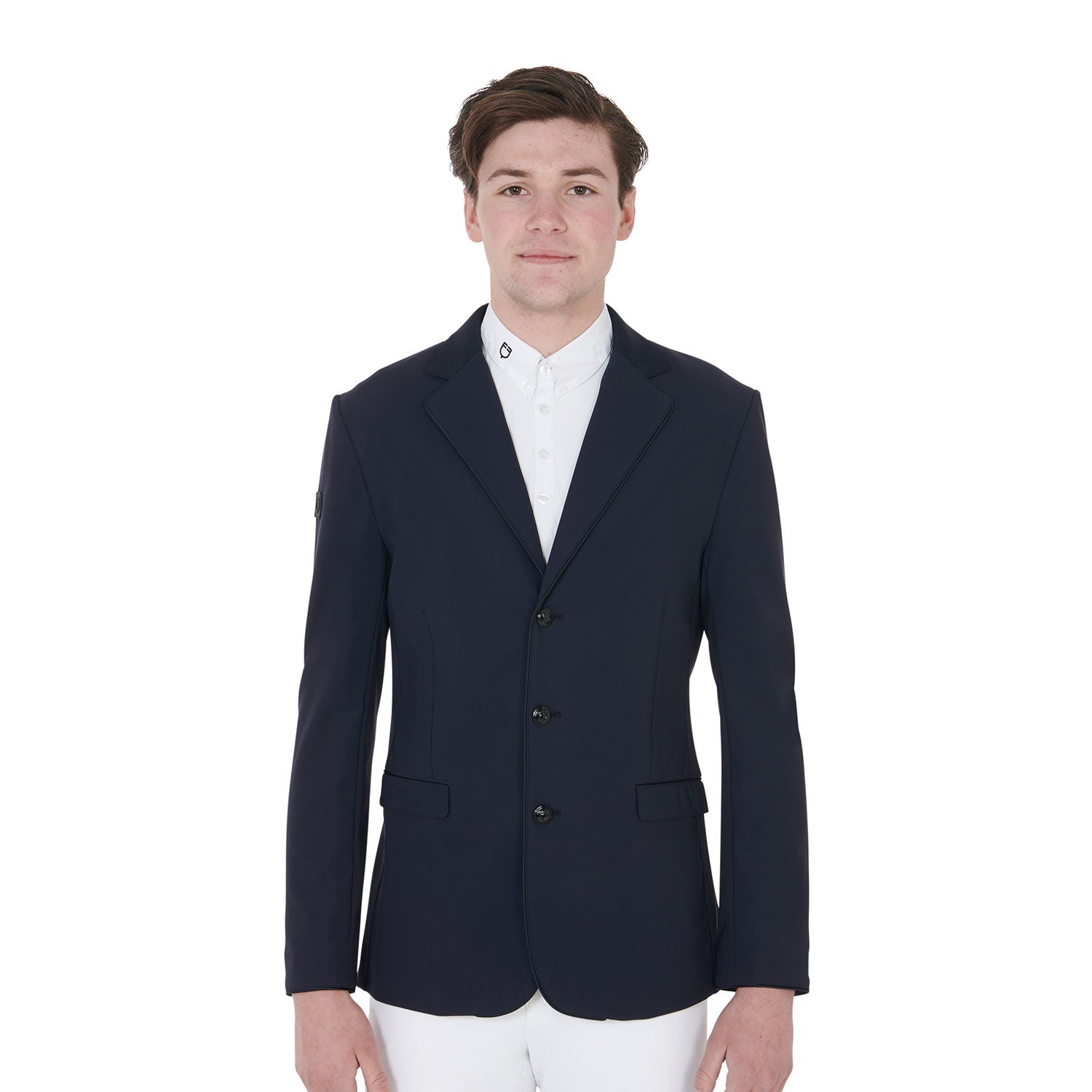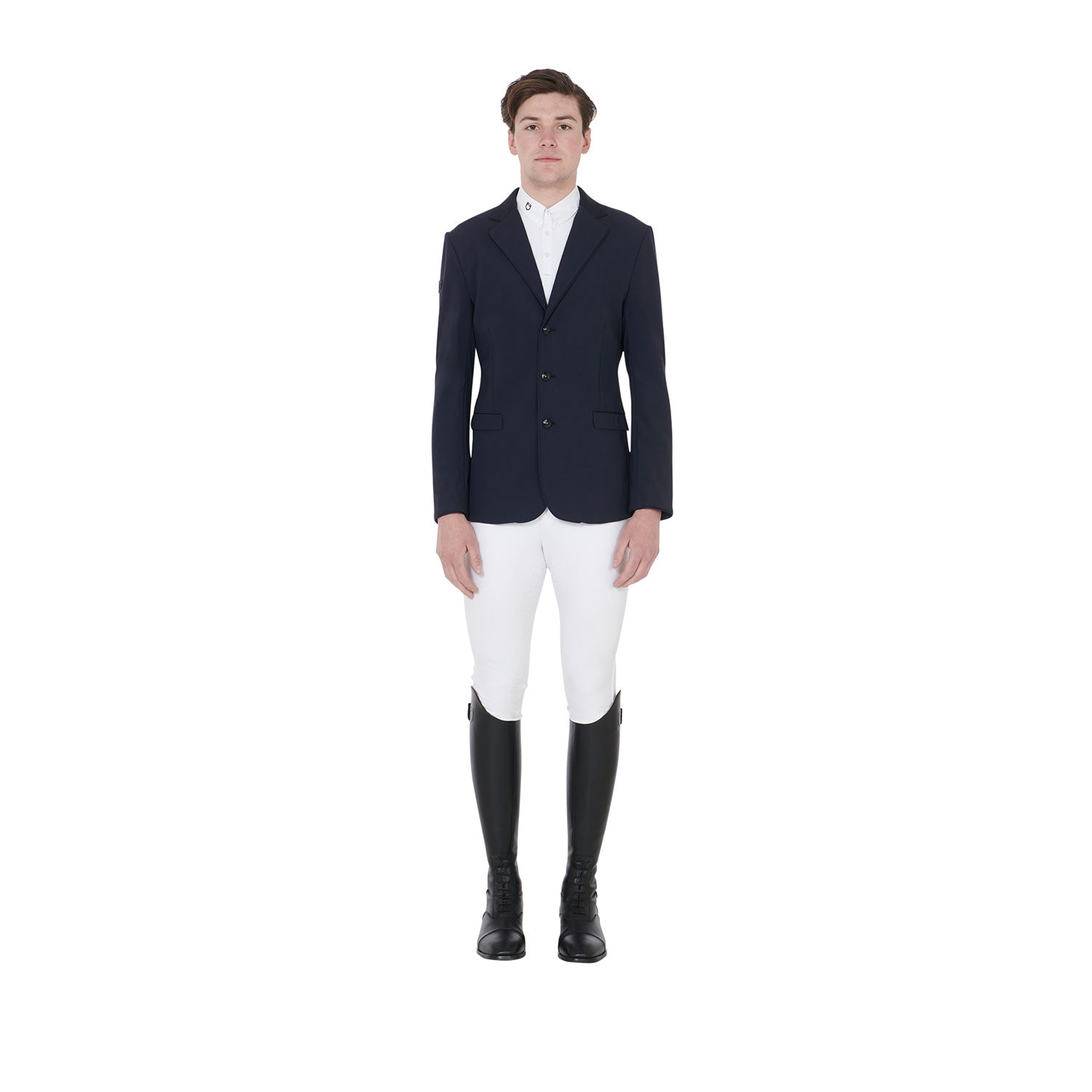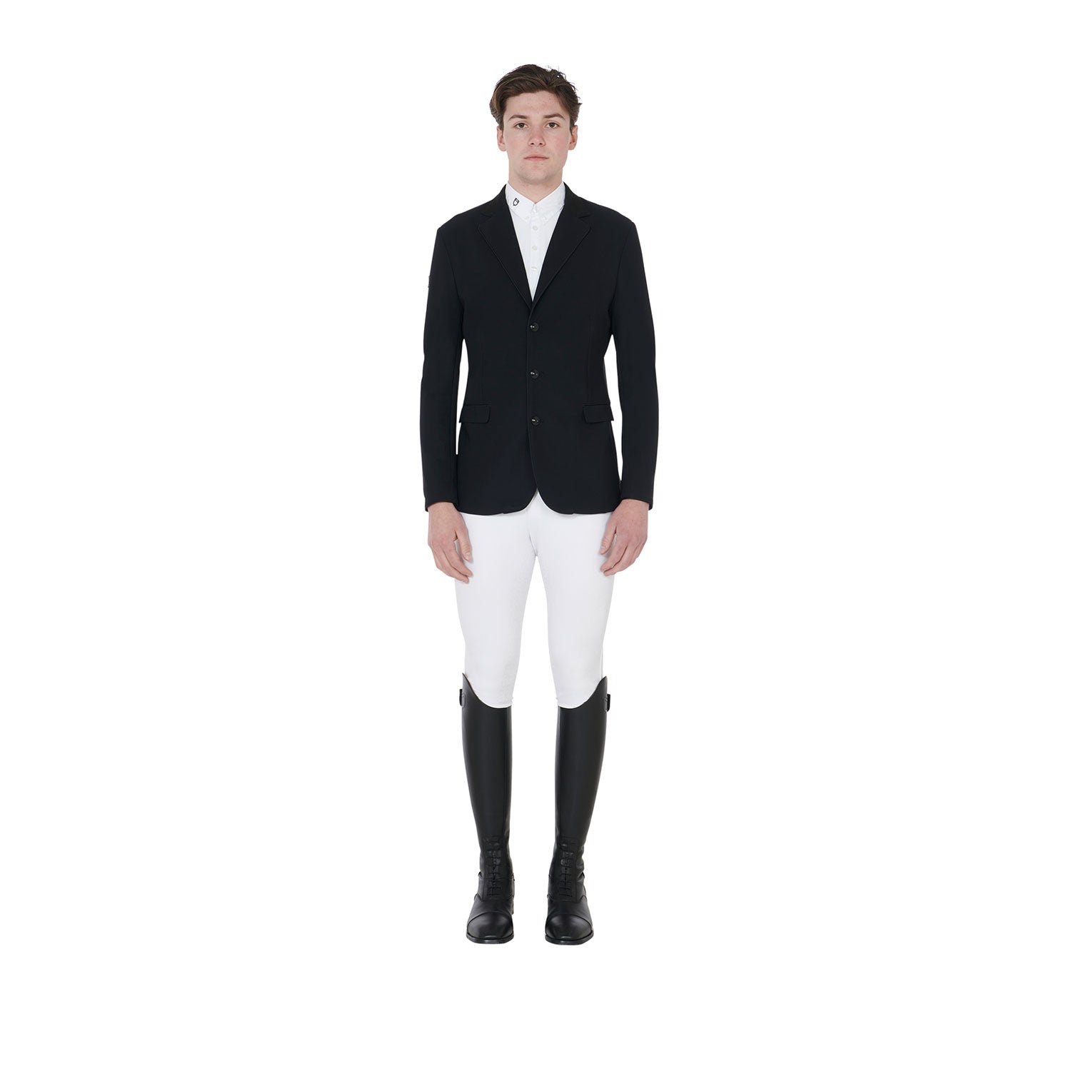 Men's Elegance competition jacket, with three buttons and Equestro logo patch on the shoulder. The breathable technical fabric guarantees a perfect fit.