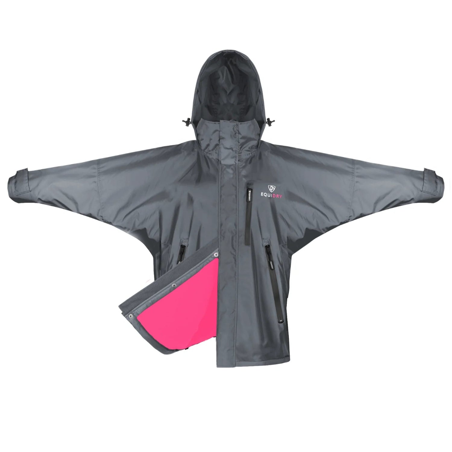 The adjustable stowaway hood is equipped with bungee toggles and a velcro strip for a customisable fit over most riding hats or a more conventional size when needed. When not required, the hood stows away neatly into the collar.