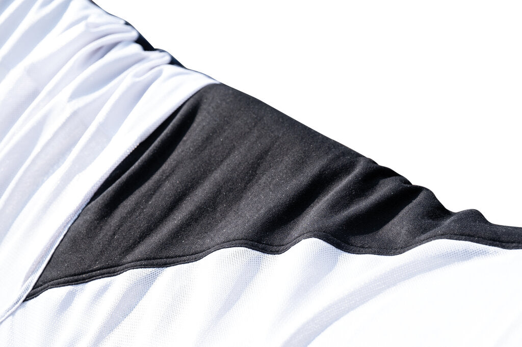 Crafted with durability and functionality in mind, this fly rug is constructed from strong materials to withstand the rigors of turnout and daily use. Its innovative design includes an attached neck cover, offering comprehensive coverage to shield your horse from head to tail.